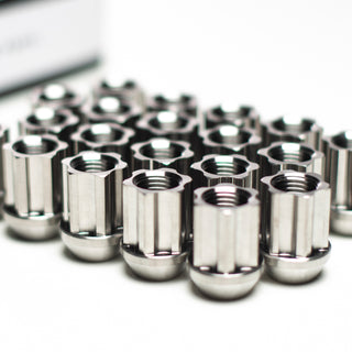 Introducing O.W.L. FORGED TITANIUM RACE NUTS, engineered from forged titanium for an ultra-light and incredibly tough performance. These race nuts feature specially machined side slots to reduce weight, requiring no special key—just a 17mm hex socket for 12mm thread lugs and a 19mm hex socket for 14mm thread lugs, with a streamlined 26.5 mm overall length. Tested beyond OEM standards for repeated installation, removal, torque handling, and retention, they are designed to withstand the demands of speed sockets. The open-ended design accommodates extended racing studs, while the original Titan 7 patent ensures innovation and uniqueness. Available in Raw Form Titanium or sleek Machine Black, these nuts offer "Forged for All" value for serious racers.